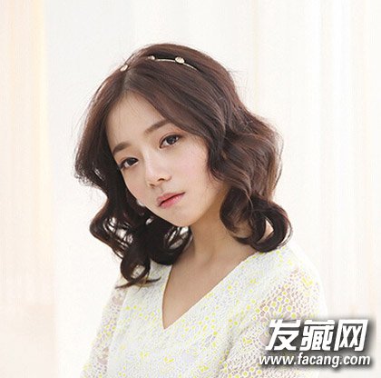 这是一款高贵甜美的公主发型,中分刘海修颜的同时很显气质,棕色的及肩卷发从耳部开始呈S型卷曲,搭配金属质感的发箍后十分优雅。