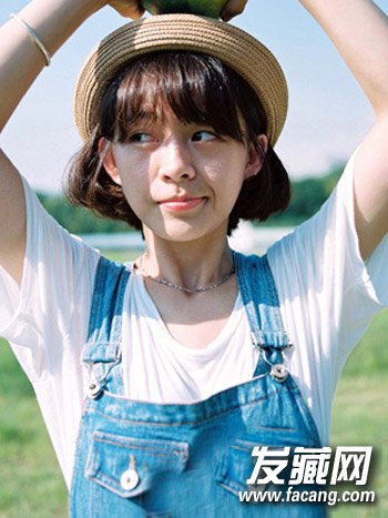非常少女系的一款日系夏天发型设计,内蓬的齐刘海短发尤其适合脸大的女生来尝试中,内扣发尾搭配齐刘海超瘦脸。