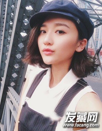 十分有个性的一款中短发烫发发型,不对称的中短发搭配上帽子勾勒出别致的时尚感来,而且发尾的外翻显露出无比的时尚感来。