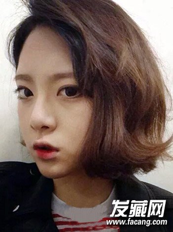 潮流MM们最爱的一款短发发型设计,侧分的中短发烫发蓬松感十足,外翻发丝更显发型飘逸,棕色染发时尚亮眼。