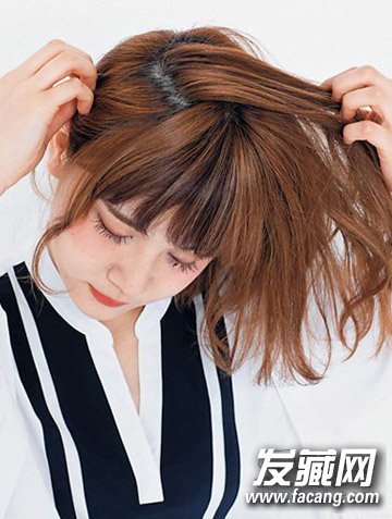 1,用手将整体分成8:2,将8分一侧的耳朵上面的头发向内卷着系。