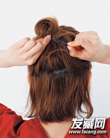 2,将发梢绕在结点的地方,一边遮住头绳,一边用发夹固定住变成丸子。