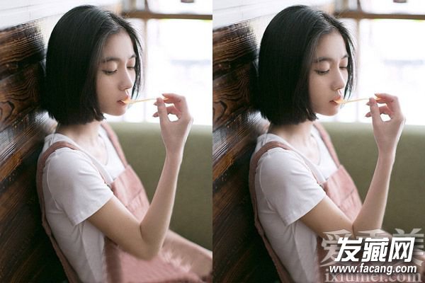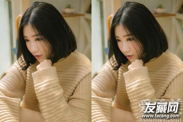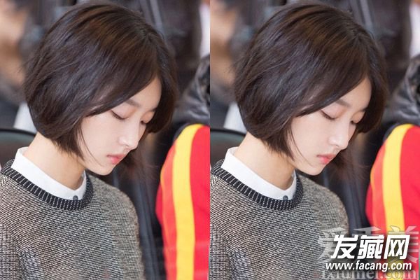 这款中分刘海短发发型设计,也是圆脸适合的发型搭配,内扣的发尾蓬松,短直发垂坠感十足,瘦脸效果极佳。