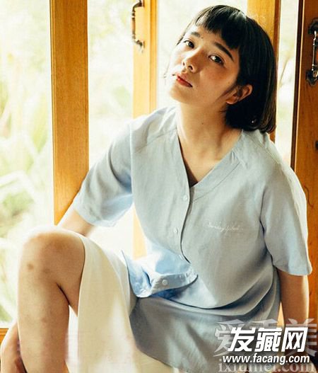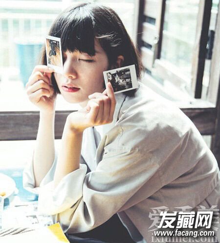 厚重感的齐刘海波波头短发,适合圆脸的MM们,将圆脸蛋修饰得瘦瘦的,也不失本来的那种可爱气质,搭配棉麻衬衫很文艺呢!