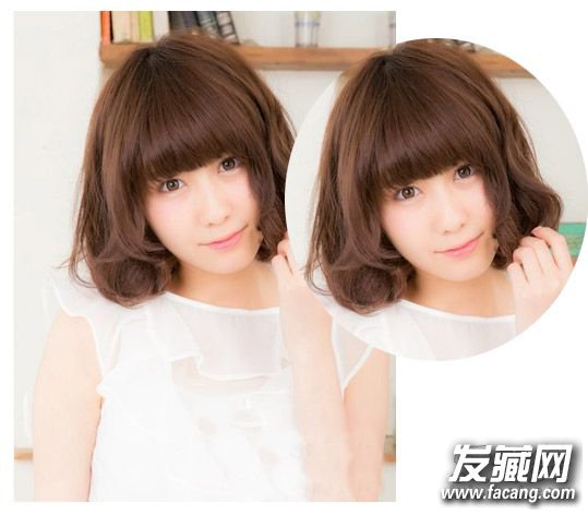 厚重的齐刘海发型设计可是最显女生的甜美可爱风的了, 而与深棕色的染发颜色中短发形式的发梢卷发形式的波波头发型,可是最显小女生的青春甜美学院风。