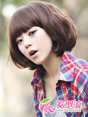 韩式短发清新动人,将头发中端至发尾营造出蓬松略高的感觉,令整体造型看上去更加丰盈,厚重的齐刘海更显饱满。