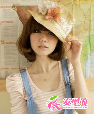 谁最喜欢短发呢?当然是我们这些追求个性十足的妞儿了.厚重的刘海,齐颈的长度,让人气色红润白皙的栗色,将模特的锁骨一览无遗的展示了出来.搭配一顶田园风格的帽子,可爱俏皮.今季,流行短发持续走红,潮范儿的你还不来试一下