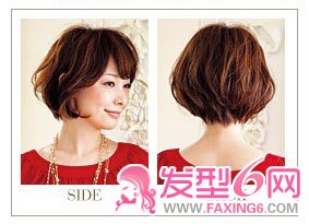 办公室好感度短发。从刘海到两鬓的圆感处于的弧线,紧紧地缩小脸的面积,发挥小颜效果。因为全部造波浪看上去很老土,发脚内卷,中间向表面翻卷的混合卷,制造出软软的轻盈的动感。用有透明感的桃红棕色染全头,制造出清纯的印象。