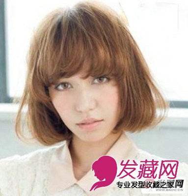 齐刘海齐颈短发,发尾修剪得非常整齐给人干净利落的感觉,内扣烫大卷后呈现包裹脸颊的弧度,衬托出了尖尖的下巴,加上内弯齐刘海发型设计,缩短了脸部距离,打造出小V脸,棕色的染发颜色很衬肤色,突显了白皙的肌肤,更加靓丽动人。
