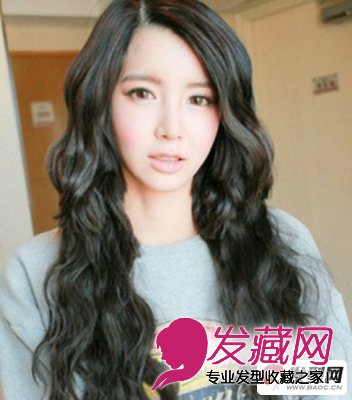 及腰长发中卷发,长发从眉心处开始烫成卷发,卷度从大到小,很有层次,中间较大的卷度营造出了蓬松感,衬托出了小V脸,斜分的长刘海发型设计增添了女性知性柔美的感觉,乌黑的发丝看着清新纯美,打造出森系女孩。
