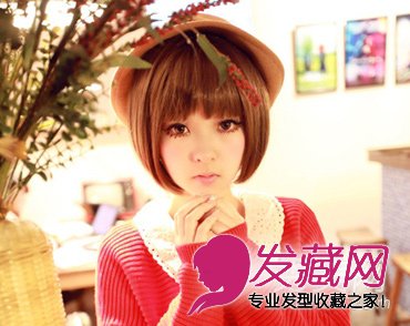 大眼非主流女孩齐刘海直短发,加礼帽和翻领的红色系毛衣搭配森女系味道尽显。