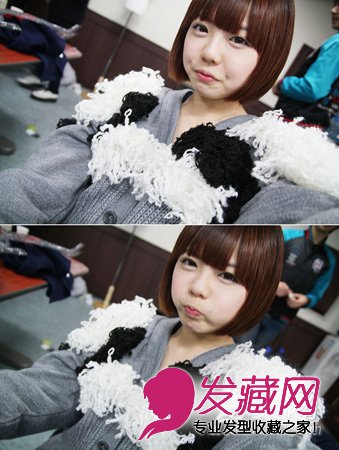 齐刘海的波波头短发,柔顺的短发打造出甜美可爱的感觉,棕色系的染发很适合这个冬季
