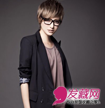 尽显OL干练的帅气女生短发发型图片,金色的头发增强女性的强势,柔顺的头发表面弧度提升时尚指数,覆盖式的刘海,配搭黑框眼镜,职场女性的气质立即显现出来。