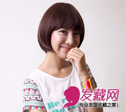 女生直短发,清纯甜美,加齐刘海搭配巧妙的修饰肉肉脸型,栗色的染发颜色增添青春时尚气息。