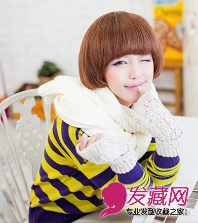 弧度圆滑的蘑菇头短发发型,棕黄色的染发更添加一种时尚的感觉。这种温暖的发色非常的适合冬天。