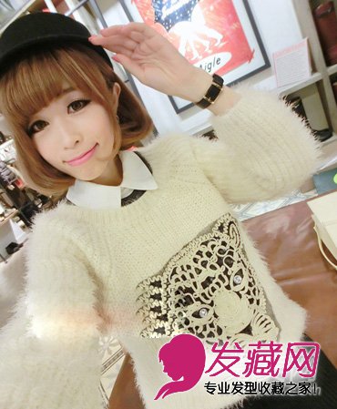 齐刘海的内扣短发,萌感萝莉,又显精灵可爱,金亚麻色的染发,非常的潮流抢眼。加黑色帽子搭配个性有范儿。