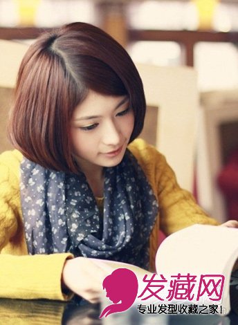 一款侧分的波波头短发发型,侧分的波波头短发被轻轻的放在耳后。有一种安静且美好的感觉,棕色系的染发为短发增添些许时尚的感觉。配上复古的黄色毛衣以及小碎花的围巾,非常的搭配呢。