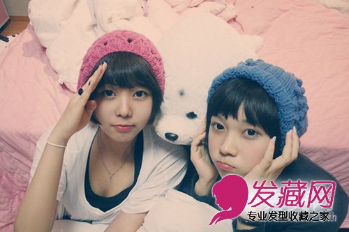 看看这两款短发发型,是不是超级有爱的呢!两款一样的齐刘海短发发型,配上不同色系的毛线帽。绝对是一款甜蜜的姐妹闺蜜发型呢!赶快和你的闺蜜,也来试试这款发型吧!