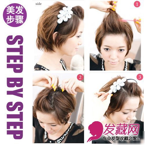 留出两边两缕刘海,戴上预先准备好的花朵造型发箍。