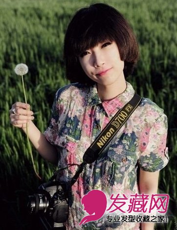 一款非常适合春季的短发发型,发型前短后长的设计配上齐刘海,打造出一种时尚的感觉。配上碎花的衬衣以及后面绿绿的草地,简直是春意昂然。