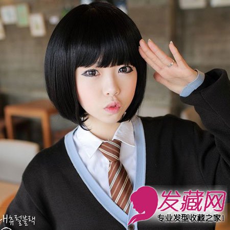齐刘海的波波头短发发型,是一款超适合学生的短发发型。黑色自然的发色没有经过烫染的效果,让整体的造型显的更为的自然。齐刘海与发尾的设计,都体现出了甜美可爱的感觉。