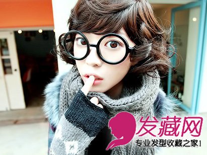一款韩式的短卷发发型,说不清楚是什么卷的卷发,无规则的散乱在头顶上。配上黑色的圆镜框,颇有搞怪的感觉。