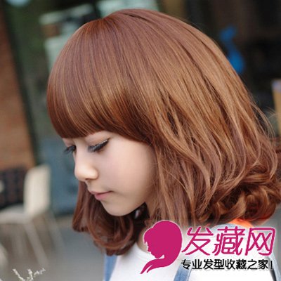 齐刘海的中短卷发发型,发尾有点类似与梨花卷的烫发效果,让整体的造型显的非常的少女。