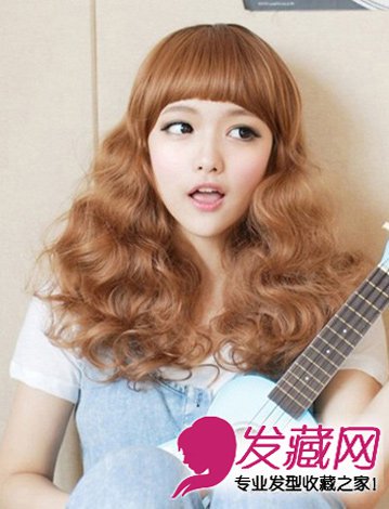 一款超级可爱的齐刘海的蛋卷烫发型。弧形的齐刘海在眉毛之上,打造出一种非常呆萌的感觉。金色的染发颜色,让人觉得像洋娃娃一样的可爱甜美,是一款很好的减龄发型哦!