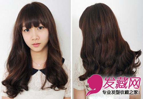 非常自然的棕黑色,这样的颜色更能打造出清新、自然的感觉,优雅的外卷设计带给女生独特的气质,厚重的卷发非常的有质感。额前打碎的齐刘海显得非常的俏丽,具有减龄的效果,打造出娇嫩的小女生气息。
