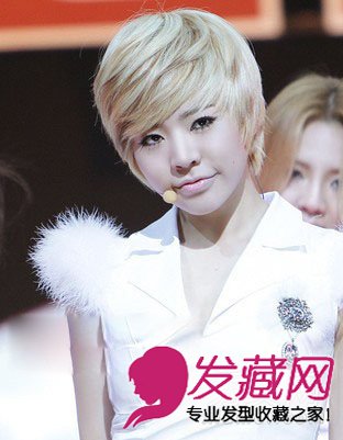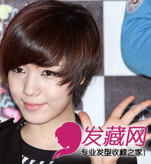 韩国百变女团T-ara中的刘花英示范少女系BOY风,侧分的刘海修饰了额头,利用鬓发的层次感将脸型打造的无比小巧。