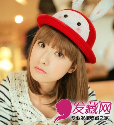 齐刘海的中短发发型,齐刘海的中短发在染上了金色的发色,非常的时尚美丽。搭上一款非常有童趣的帽子,效果就更好了。