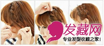 两侧的头发编成粗麻花到耳际,再编成三股粗辩,发端用橡皮筋扎好。脸周头发稍微保留些。