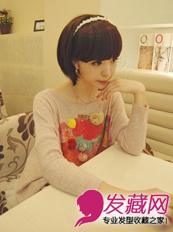 齐刘海的短发发型,是一款非常甜美的女生短发发型。蓬松饱满的短发发型衬显的脸非常的小巧。配上一款白色珍珠的发箍,淑女范十足。