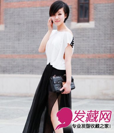 一款较短款的斜刘海短发发型,大片的斜刘海遮盖在脸上显的非常的有范,配上黑色的雪纺长裙,是不是很有御姐般的感觉呢?