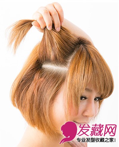 Step2:以耳际往上一点为分界线,如图所示,取一大束头发,一只手手抓住往上提高,注意前面要留出一些头发做修饰。