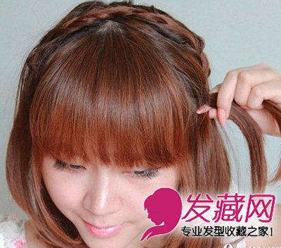 步骤五:抓住麻花辫的尾部,微微调整整个麻花辫发箍的位置.