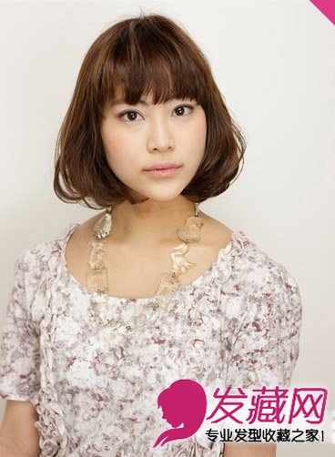 发型点评:稍显凌乱的齐刘海看起来更显自然。波波头发尾烫出饱满蓬松的纹理,修饰出一张精致鹅蛋脸。