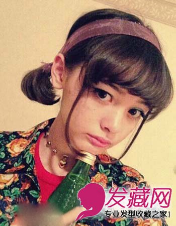 齐眉的微卷刘海造型搭配两颊散落的发丝衬托了女生的小脸,短发扎成小马尾,配以发箍固定,很是时尚。