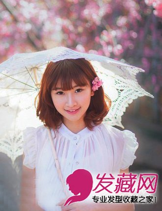 这款红棕色的梨花头发型,也是短发想中很受欢迎的发型,搭配齐刘海的造型,清纯甜美的气质突显,红花的点缀,更有青春气息,撑着雨伞,让人想起徐志摩笔下的丁香姑娘。