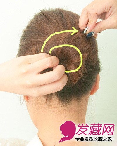 STEP 4:绕着结尾处转一圈后,将发尾藏在花苞头后面,夹在橡筋里就好了。