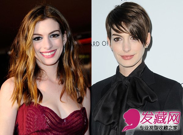 安妮·海瑟薇绝对是从长发到短发造型转变最为成功的女星之一,曾经长发造型充满性感诱惑,而换上一头短发之后,立刻变得神清气爽,英气十足。