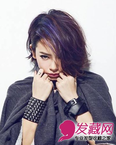 侧分的短发遮住半边脸,搭配上挑染的紫色头发增添了神秘感,发丝微卷飘逸,时尚感十足。