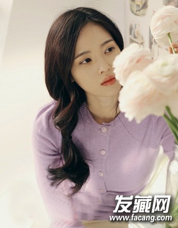 淡紫色的针织衫与一款优雅的侧马尾搭配起来显露出一种宁静的惬意感,长卷发女人味十足,精致的瓜子脸勾勒出别致的时尚感来,十分有气质。
