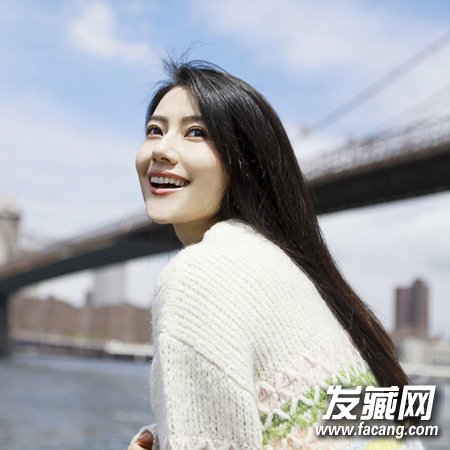 清纯的三七分黑直发突出了高圆圆优雅的气质,刘海顺着脸颊自然垂落很修颜,头发全部披在后背自然清爽,阳光下的一个甜美笑容融化人心。