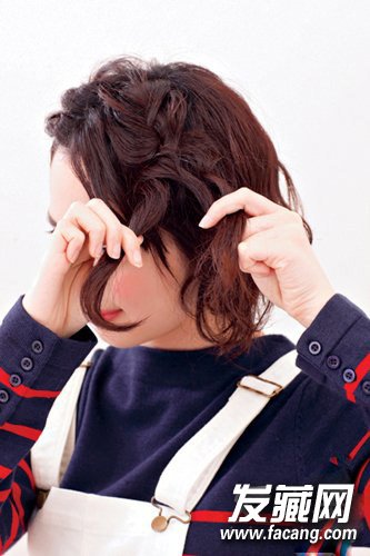 2,挑取一束刘海,与其余的刘海和脸周的发丝一起编织成较粗的发辫。