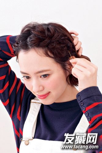 3,编至耳朵上方后,用发夹由下往上插入固定。另一侧使用相同手法。