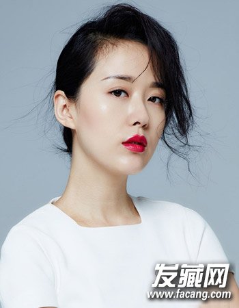 性感的红唇勾勒出别致的时尚感来,前额的刘海加上卷发烫发的设计显露出无比的时尚感来,简单的低发髻盘发显露出别致的时尚感来,造型简单而且时尚。