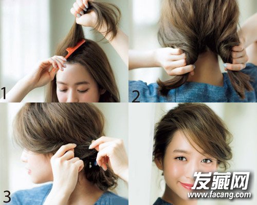 step 3:将剩余的发丝想侧边扭转用黑色发卡固定,打造出蓬松的斜刘海造型。