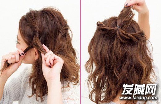step 2:另一侧头发进行扭转,之后两束头发结合扎成小马尾,向内翻转。