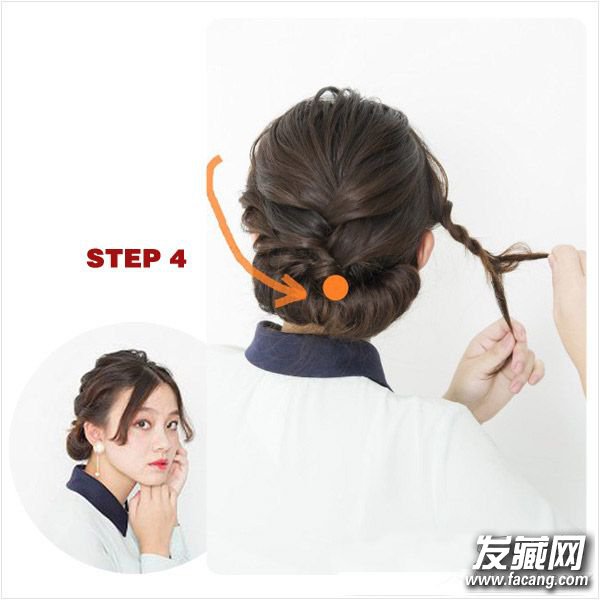 从左右两边各自取发束分成两半交互扭转并拉到后面,最后用发夹在橙色圆圈位置上固定在一起即可。